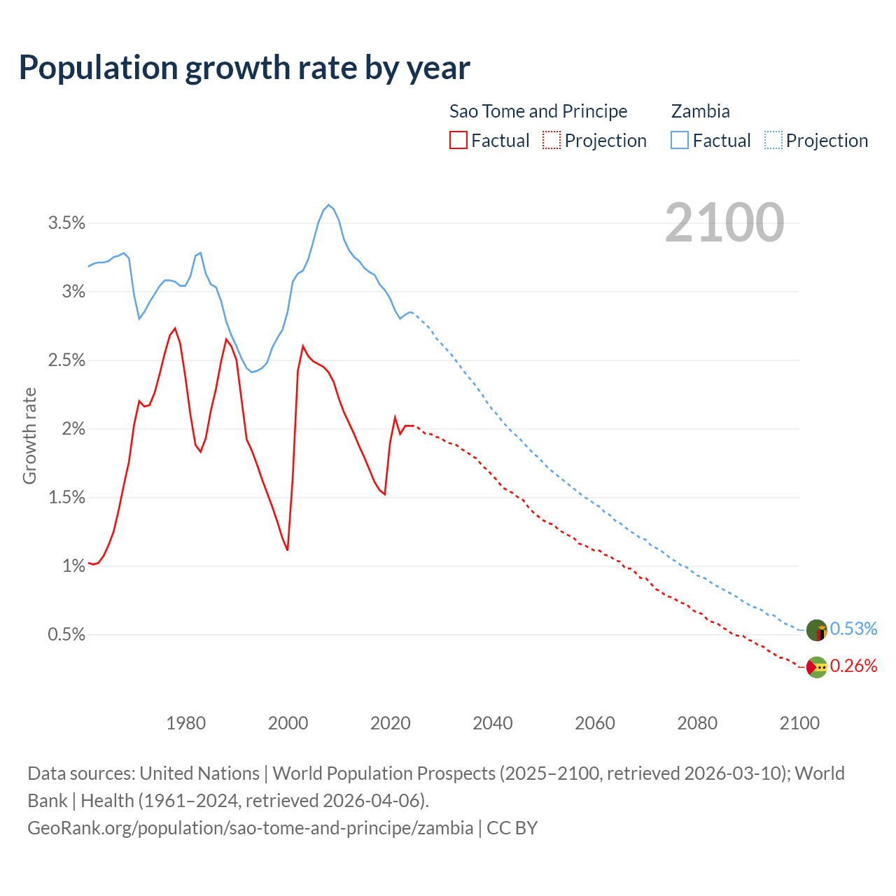 - For the last 10 years, Sao Tome and Principe has had an average growth rate of +1.82% per year vs +3% in Zambia.