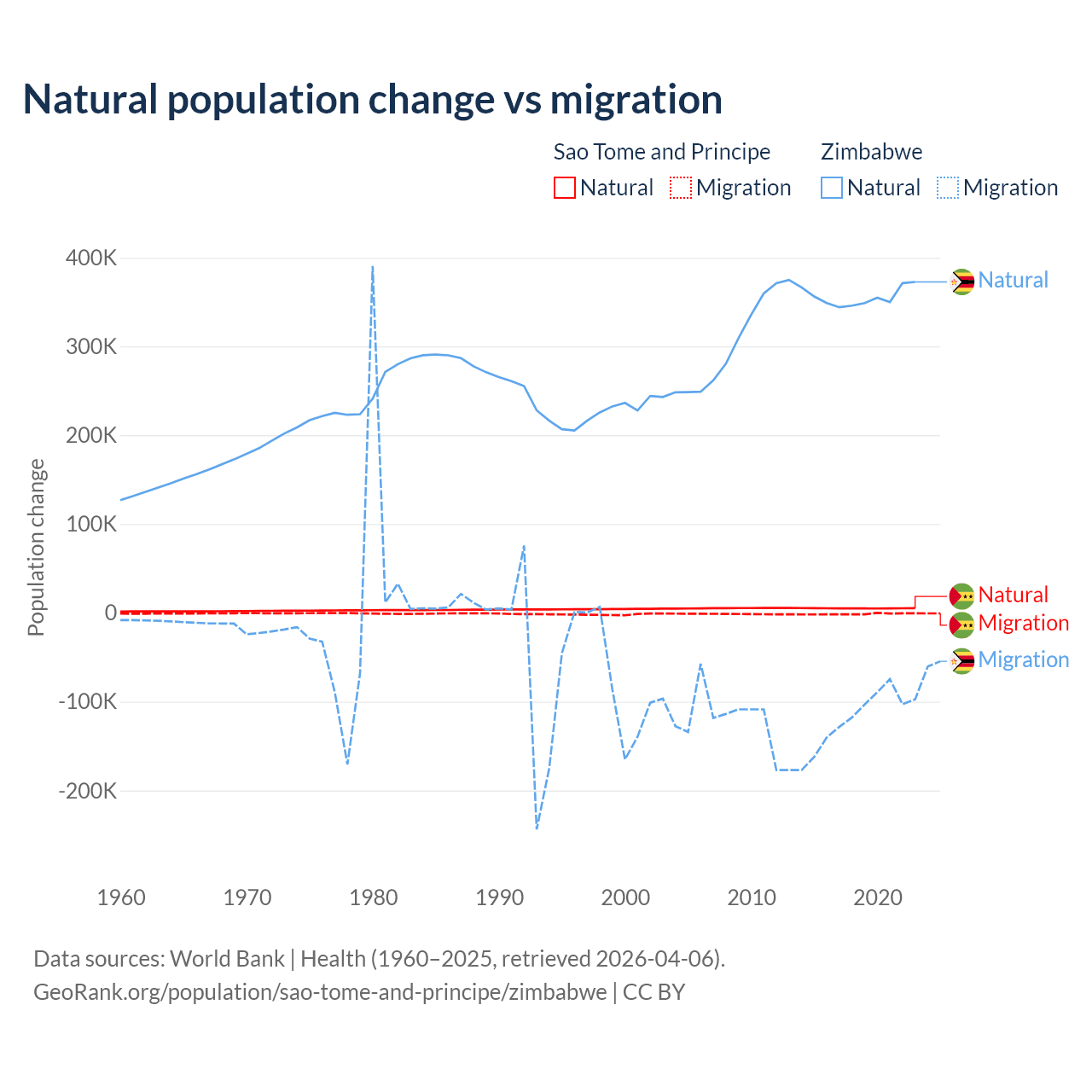 Over the last 10 years, 80.1% of the population change in Sao Tome and Principe is from natural causes (a gain of 50,822 people) and 19.9% is from migration (a loss of 12,621 people). In Zimbabwe 74.9% is from natural causes (a gain of 3,558,487 people) and 25.1% is from migration (a loss of 1,192,807 people).