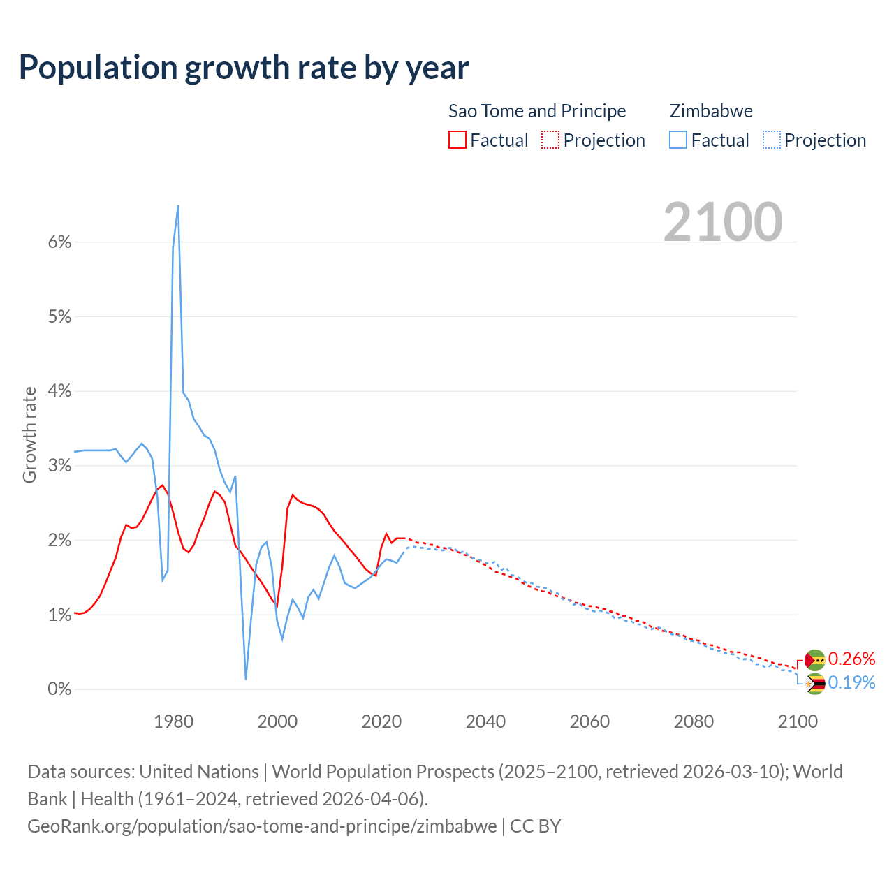 - For the last 10 years, Sao Tome and Principe has had an average growth rate of +1.82% per year vs +1.57% in Zimbabwe.
