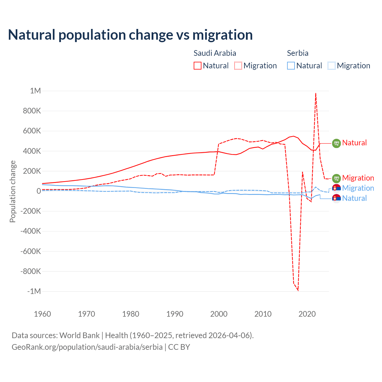 Over the last 10 years, 93.9% of the population change in Saudi Arabia is from natural causes (a gain of 4,829,562 people) and 6.05% is from migration (a gain of 311,209 people). In Serbia 83.3% is from natural causes (a loss of 435,148 people) and 16.7% is from migration (a loss of 87,110 people).