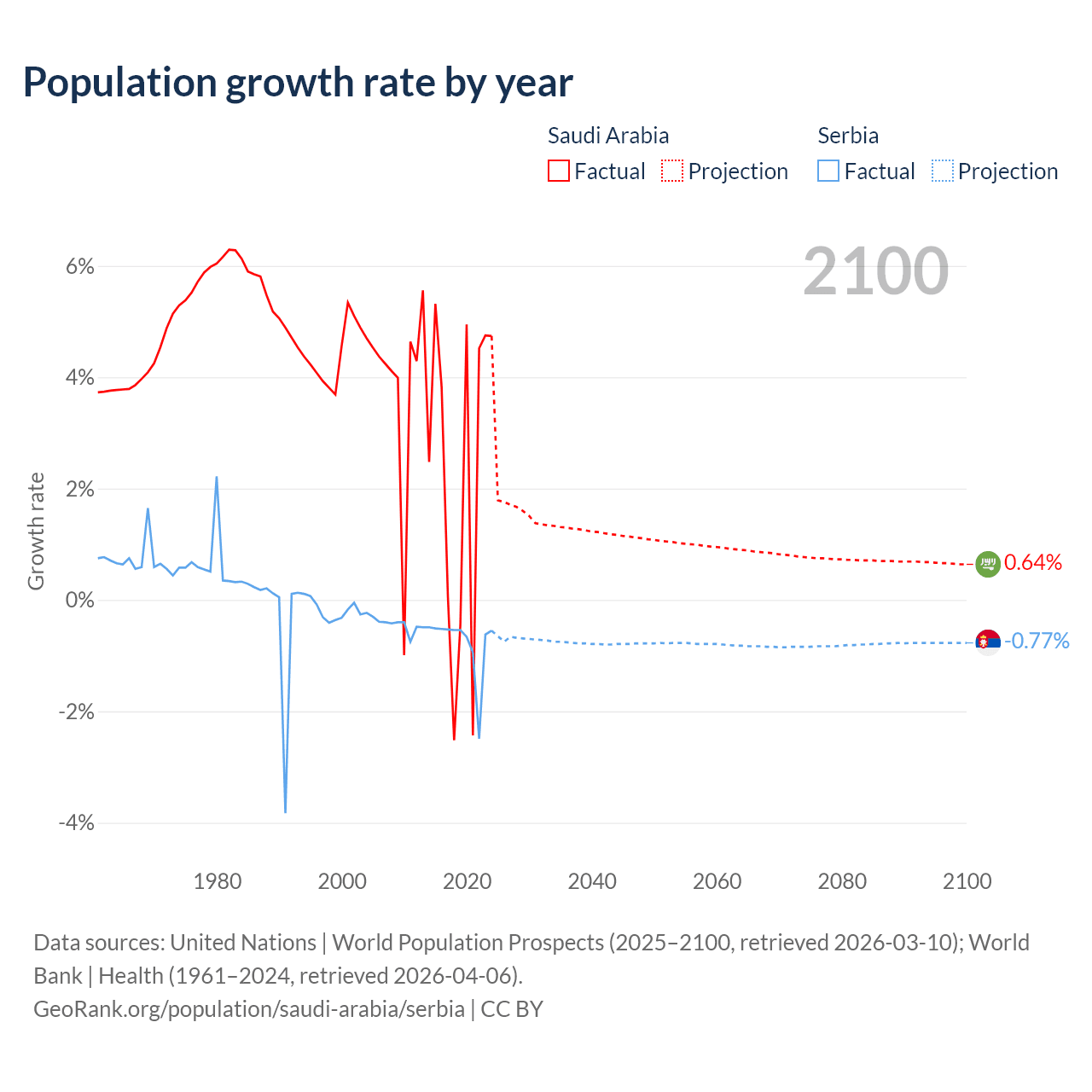 - For the last 10 years, Saudi Arabia has had an average growth rate of +2.3% per year vs -0.76% in Serbia.