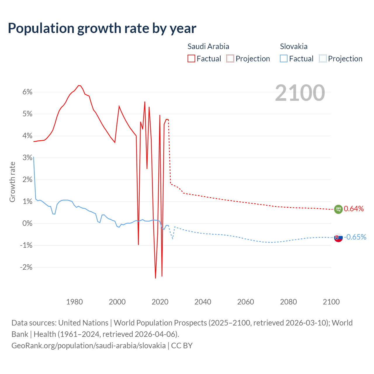 - For the last 10 years, Saudi Arabia has had an average growth rate of +2.3% per year vs +0.01% in Slovakia.