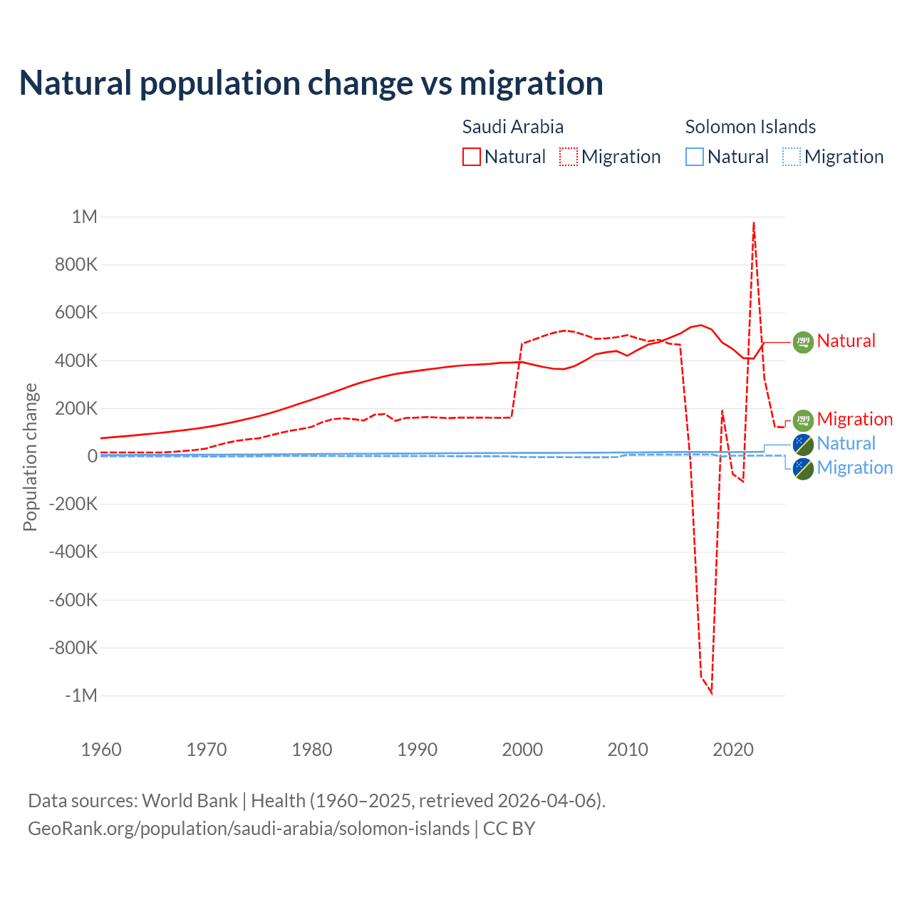 Over the last 10 years, 93.9% of the population change in Saudi Arabia is from natural causes (a gain of 4,829,562 people) and 6.05% is from migration (a gain of 311,209 people). In the Solomon Islands 82.8% is from natural causes (a gain of 168,727 people) and 17.2% is from migration (a gain of 35,031 people).