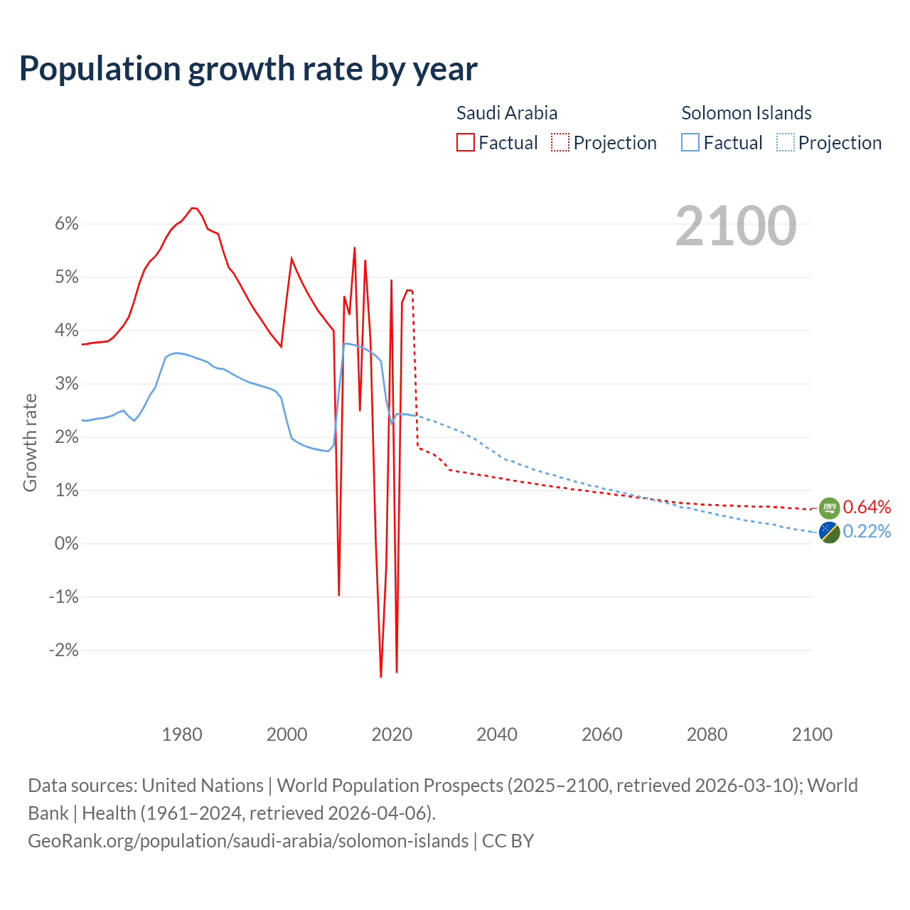 - For the last 10 years, Saudi Arabia has had an average growth rate of +2.3% per year vs +2.95% in the Solomon Islands.