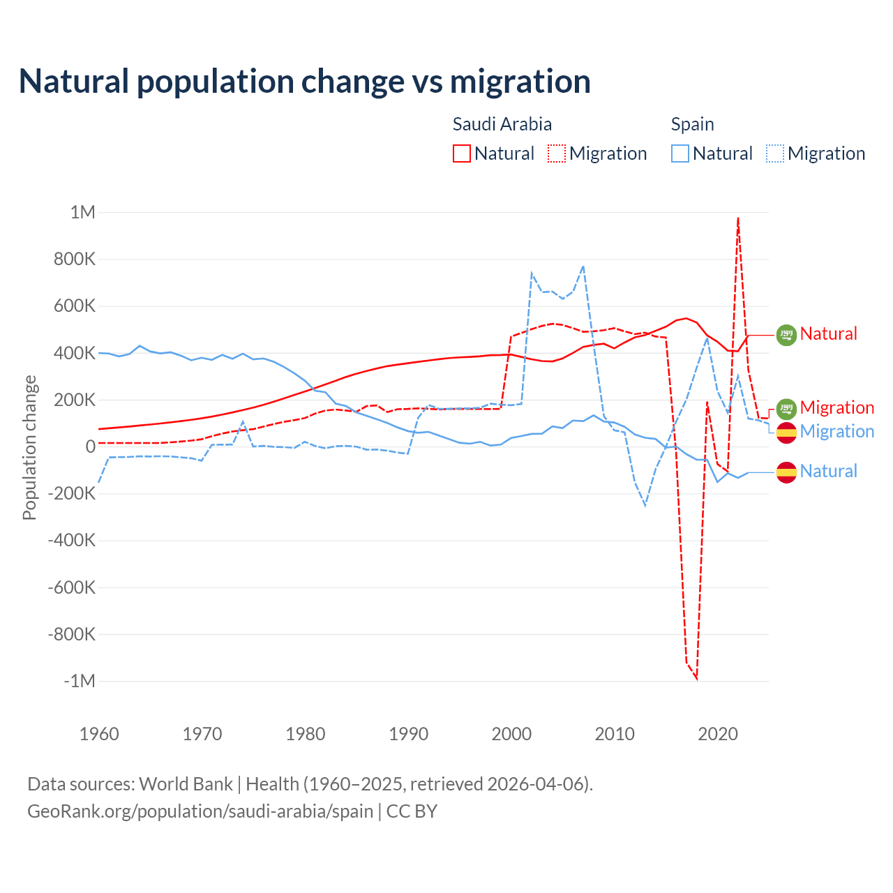 Over the last 10 years, 93.9% of the population change in Saudi Arabia is from natural causes (a gain of 4,829,562 people) and 6.05% is from migration (a gain of 311,209 people). In Spain 25.8% is from natural causes (a loss of 627,829 people) and 74.2% is from migration (a gain of 1,810,127 people).