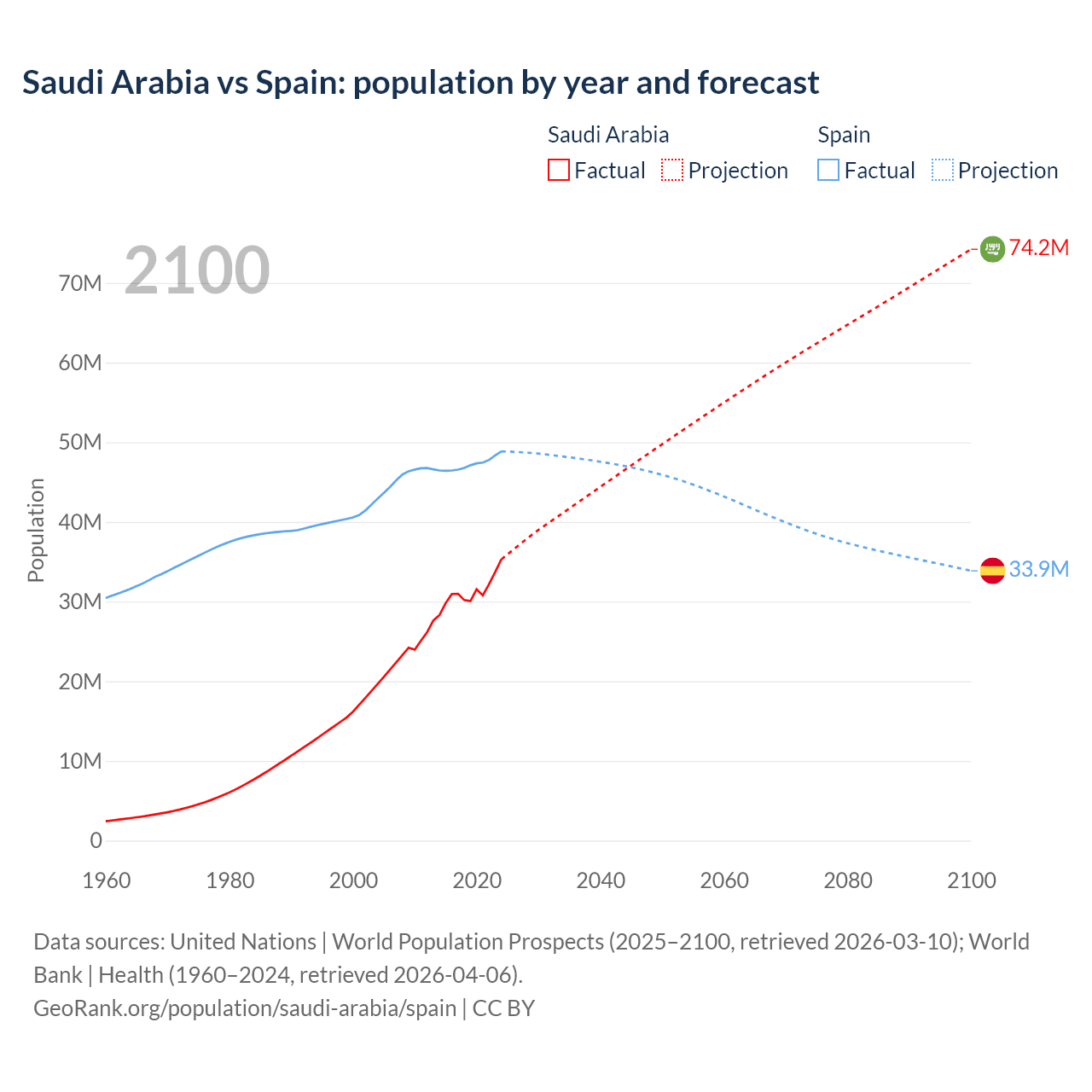 The latest officially reported population of Saudi Arabia was 35,300,280 in 2024 vs 48,848,840 people in Spain in 2024. In 2026, based on the adjusted UN estimation, the current Saudi Arabia's population is 36,734,925 people compared to 48,806,901 in Spain.
