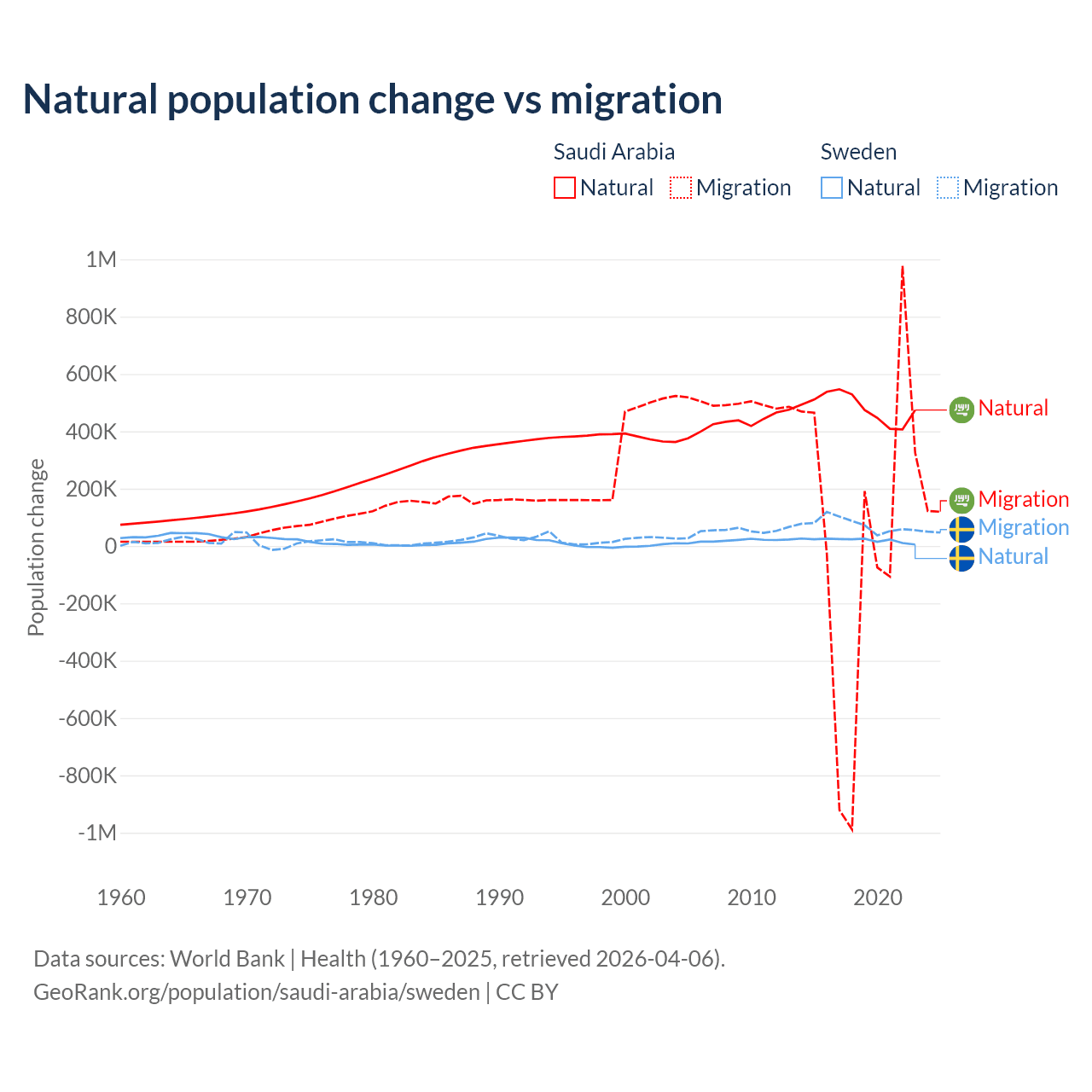 Over the last 10 years, 93.9% of the population change in Saudi Arabia is from natural causes (a gain of 4,829,562 people) and 6.05% is from migration (a gain of 311,209 people). In Sweden 21.4% is from natural causes (a gain of 201,900 people) and 78.6% is from migration (a gain of 743,642 people).