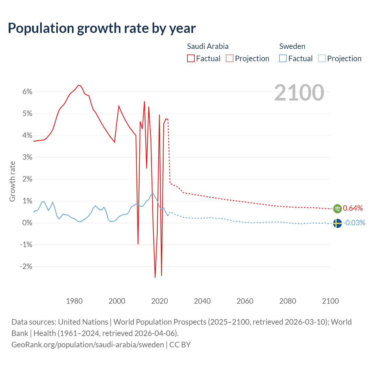 - For the last 10 years, Saudi Arabia has had an average growth rate of +2.3% per year vs +0.88% in Sweden.