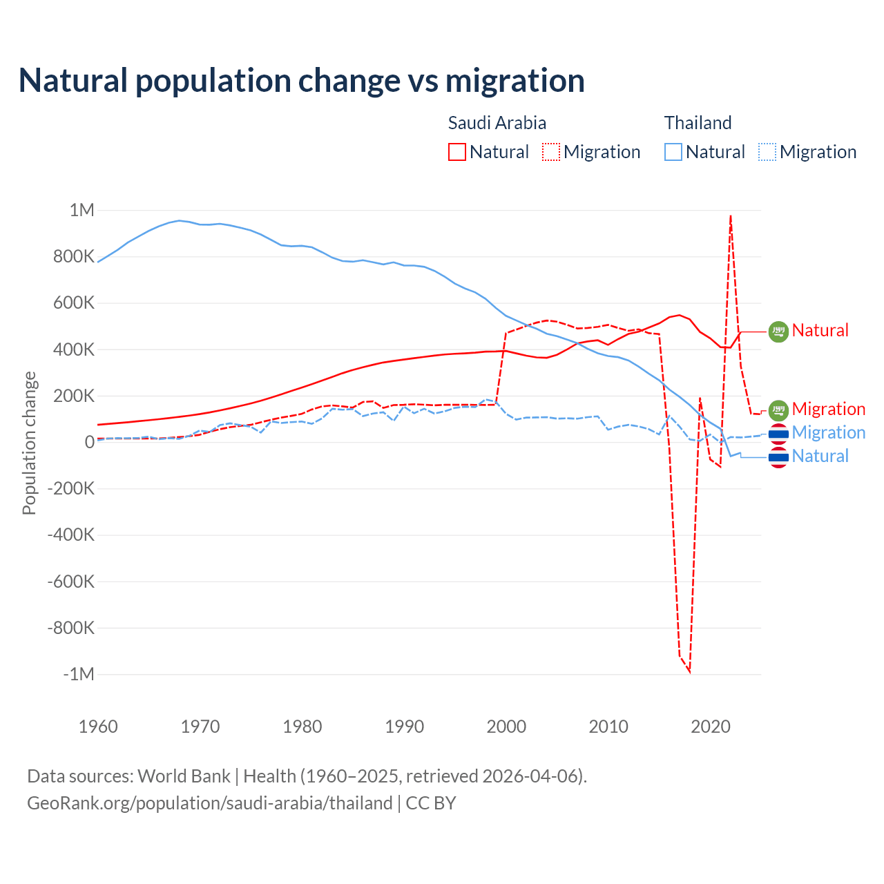 Over the last 10 years, 93.9% of the population change in Saudi Arabia is from natural causes (a gain of 4,829,562 people) and 6.05% is from migration (a gain of 311,209 people). In Thailand 78.4% is from natural causes (a gain of 1,292,528 people) and 21.6% is from migration (a gain of 355,361 people).