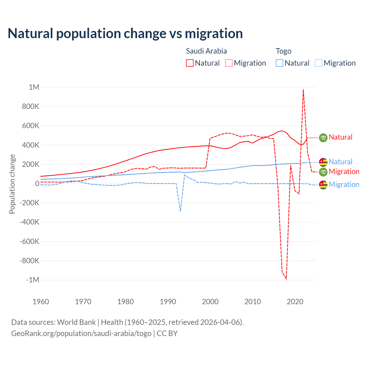 Over the last 10 years, 93.9% of the population change in Saudi Arabia is from natural causes (a gain of 4,829,562 people) and 6.05% is from migration (a gain of 311,209 people). In Togo 99.1% is from natural causes (a gain of 2,052,115 people) and 0.86% is from migration (a loss of 17,852 people).