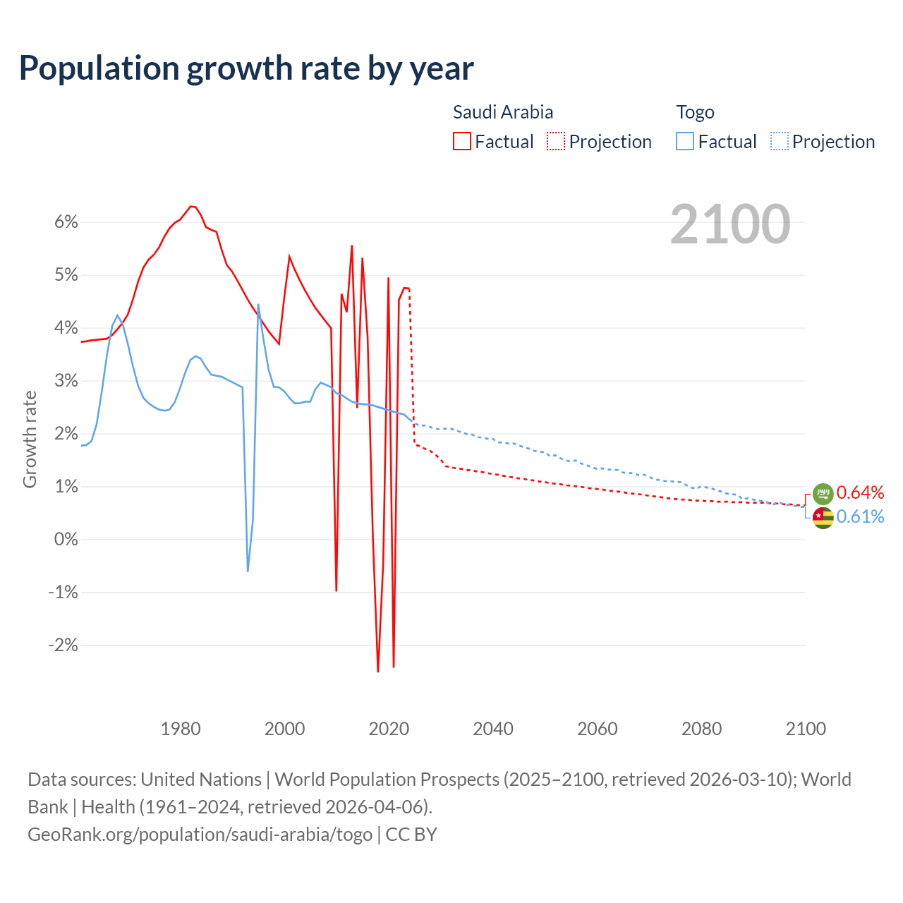 - For the last 10 years, Saudi Arabia has had an average growth rate of +2.3% per year vs +2.46% in Togo.