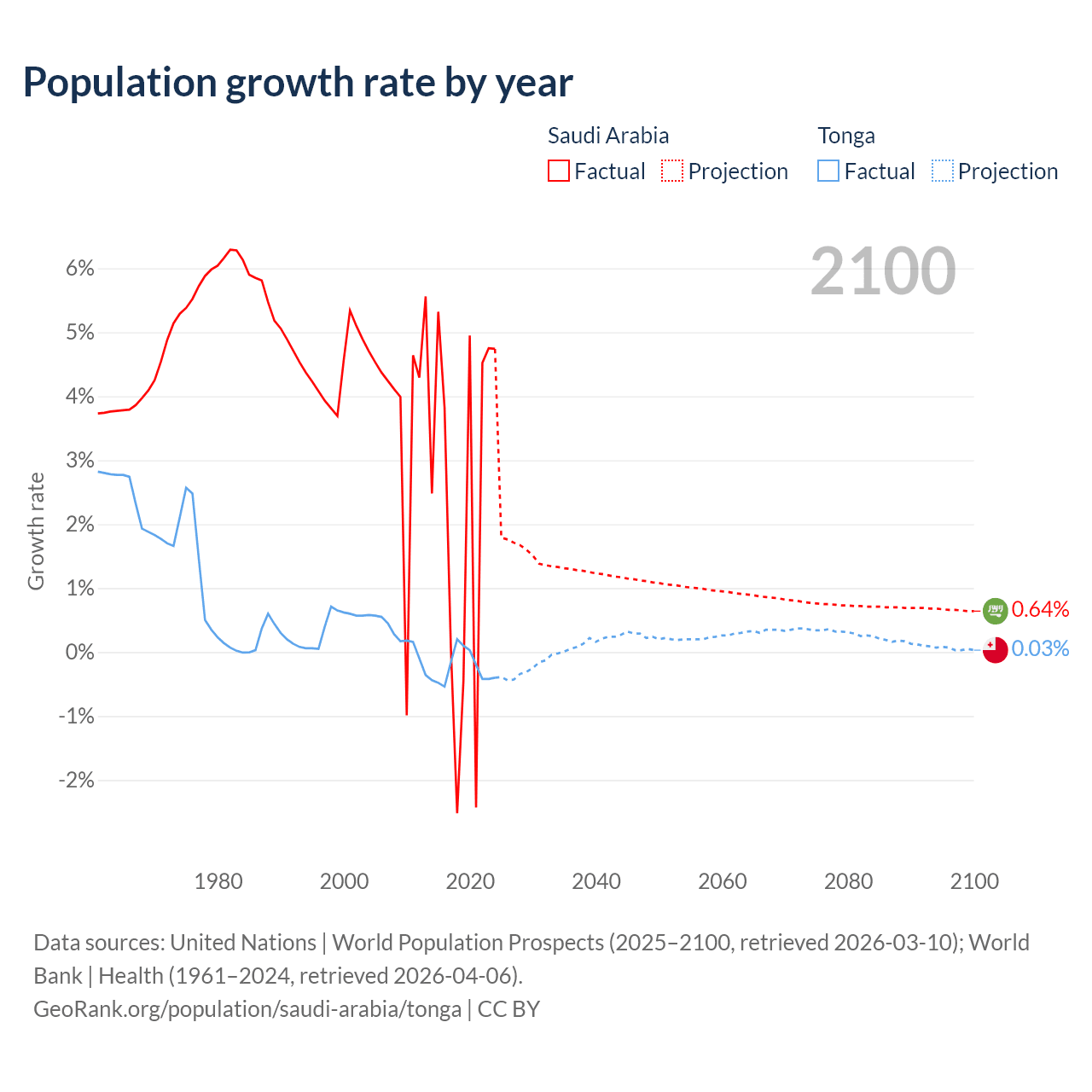- For the last 10 years, Saudi Arabia has had an average growth rate of +2.3% per year vs -0.25% in Tonga.