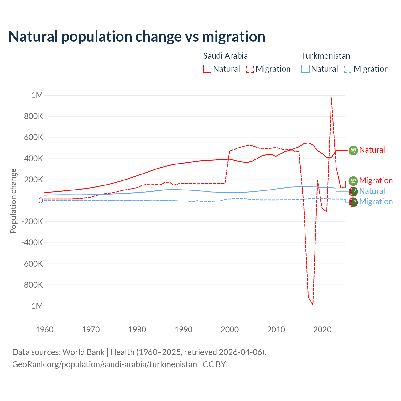 Over the last 10 years, 93.9% of the population change in Saudi Arabia is from natural causes (a gain of 4,829,562 people) and 6.05% is from migration (a gain of 311,209 people). In Turkmenistan 89.2% is from natural causes (a gain of 1,270,228 people) and 10.8% is from migration (a gain of 154,379 people).