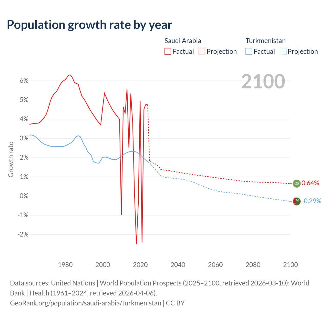 - For the last 10 years, Saudi Arabia has had an average growth rate of +2.3% per year vs +2.14% in Turkmenistan.