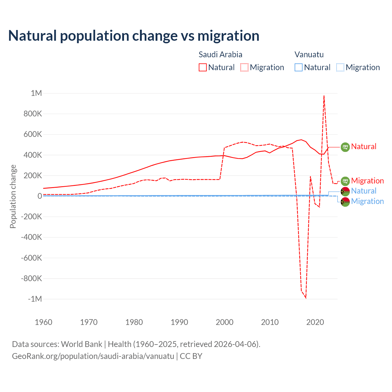 Over the last 10 years, 93.9% of the population change in Saudi Arabia is from natural causes (a gain of 4,829,562 people) and 6.05% is from migration (a gain of 311,209 people). In Vanuatu 92.2% is from natural causes (a gain of 72,941 people) and 7.81% is from migration (a loss of 6,181 people).