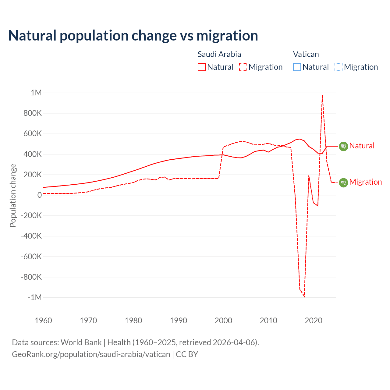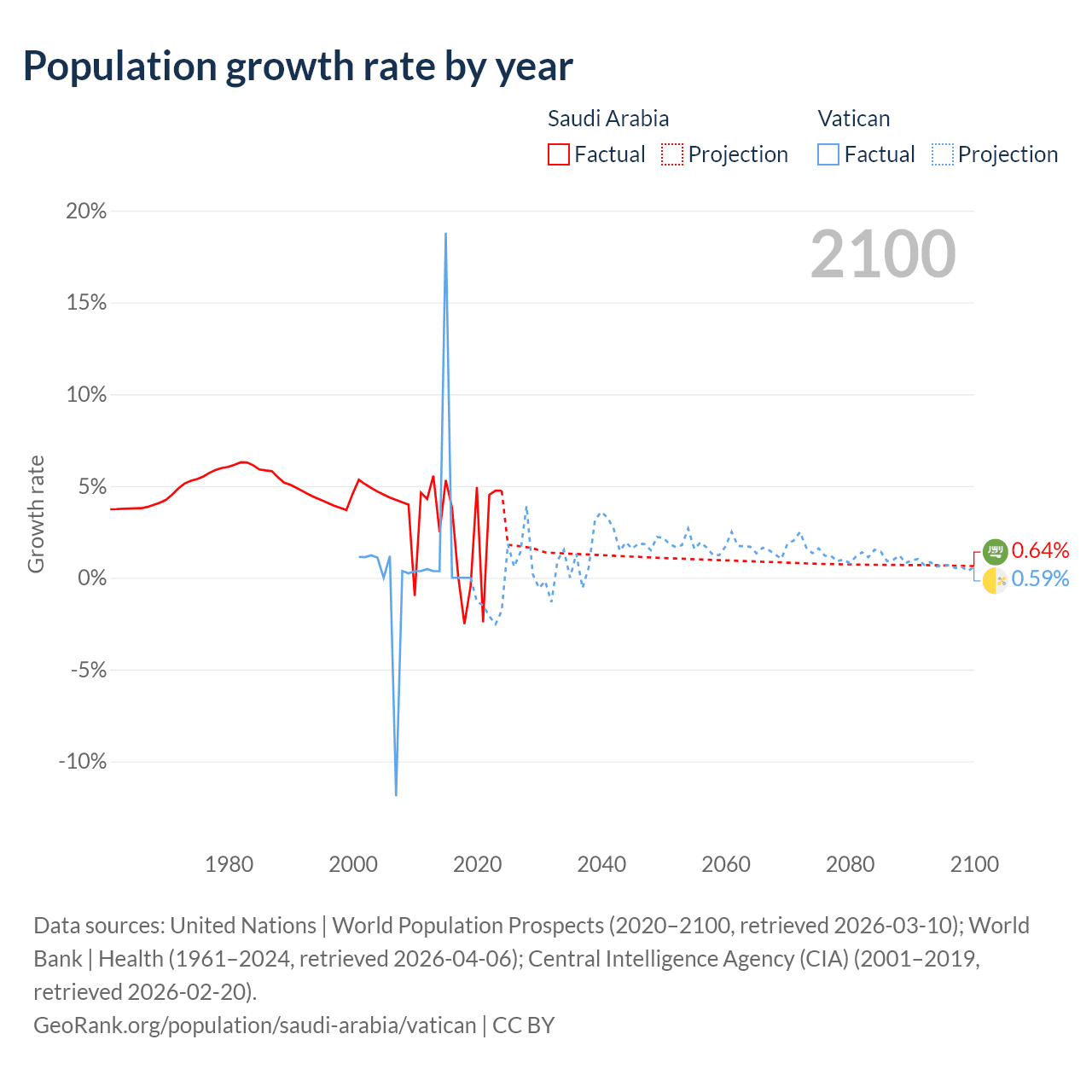 - For the last 10 years, Saudi Arabia has had an average growth rate of +2.3% per year vs +1.9% in the Vatican.