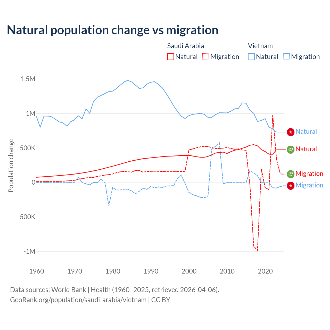 Over the last 10 years, 93.9% of the population change in Saudi Arabia is from natural causes (a gain of 4,829,562 people) and 6.05% is from migration (a gain of 311,209 people). In Vietnam 97.7% is from natural causes (a gain of 9,349,756 people) and 2.29% is from migration (a gain of 219,073 people).
