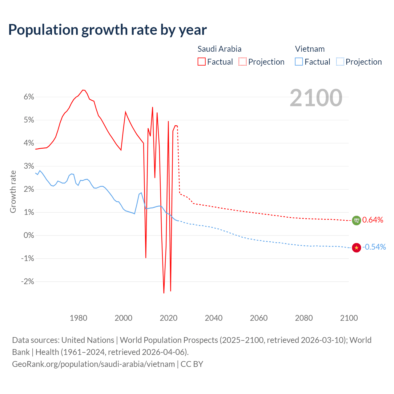 - For the last 10 years, Saudi Arabia has had an average growth rate of +2.3% per year vs +0.99% in Vietnam.