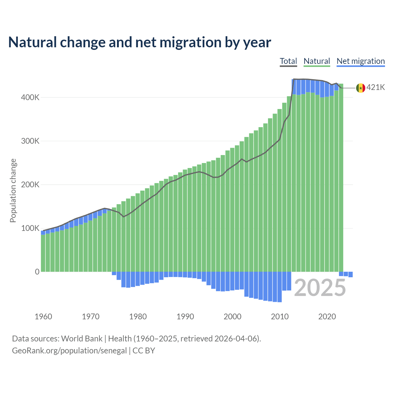 Over the last 10 years, 93.9% of the population change in Senegal is from natural causes (a gain of 4,089,205 people) and 6.13% is from migration (a gain of 267,266 people).