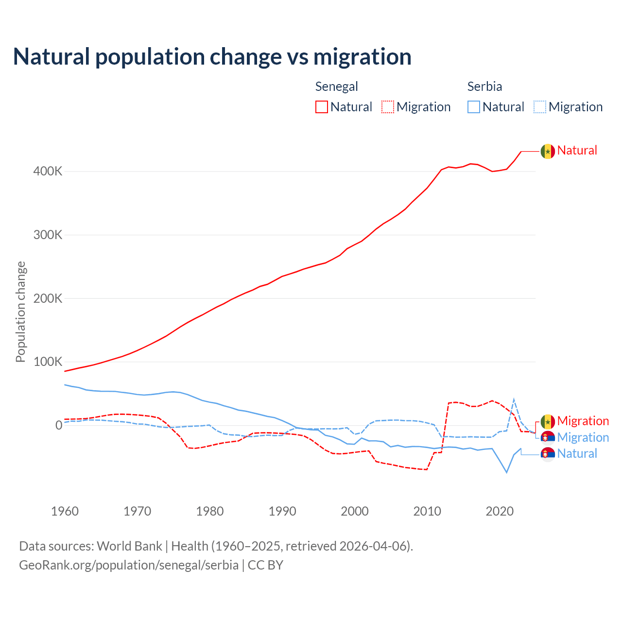 Over the last 10 years, 93.9% of the population change in Senegal is from natural causes (a gain of 4,089,205 people) and 6.13% is from migration (a gain of 267,266 people). In Serbia 83.3% is from natural causes (a loss of 435,148 people) and 16.7% is from migration (a loss of 87,110 people).