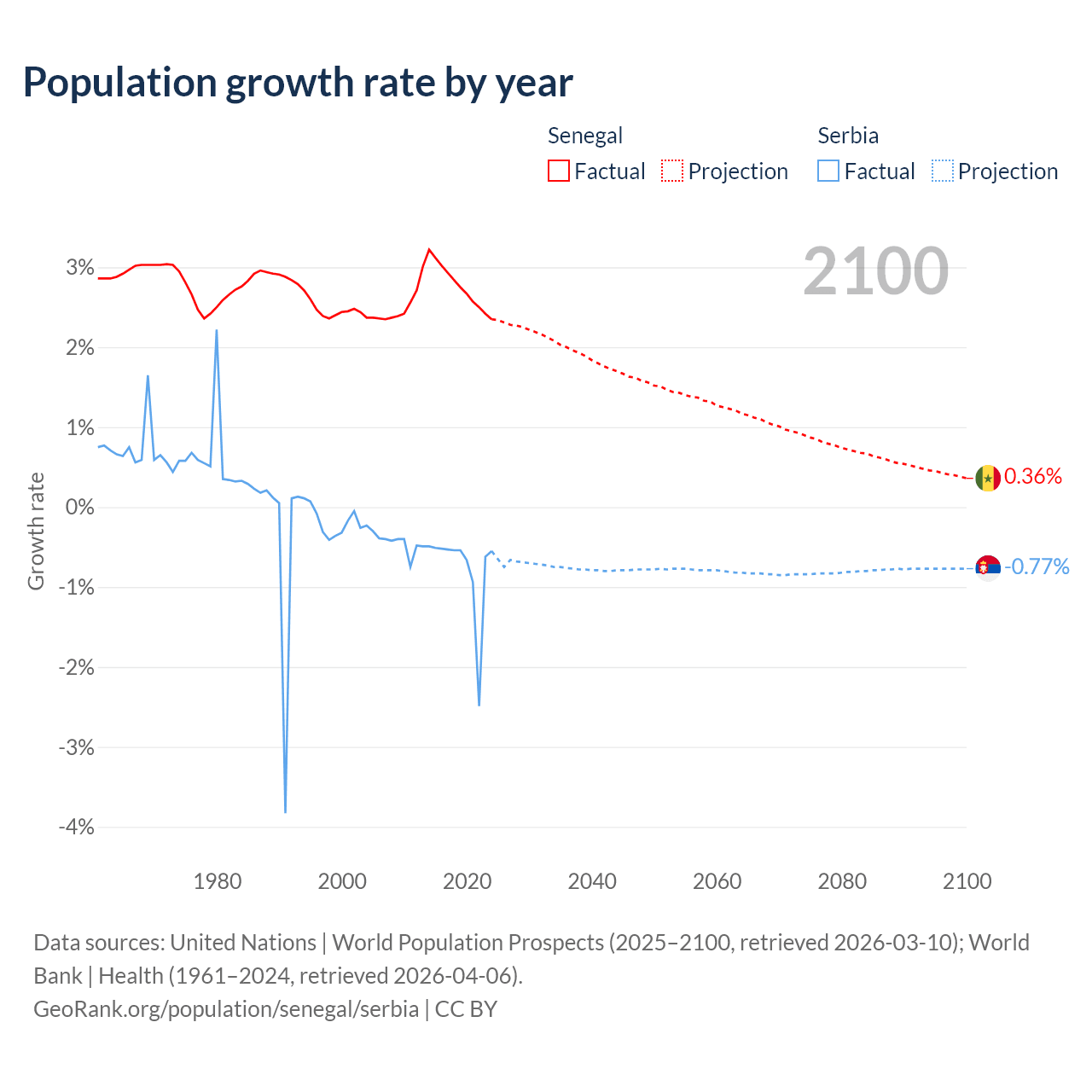 - For the last 10 years, Senegal has had an average growth rate of +2.76% per year vs -0.76% in Serbia.