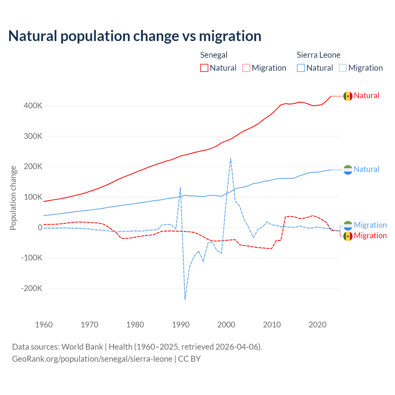 Over the last 10 years, 93.9% of the population change in Senegal is from natural causes (a gain of 4,089,205 people) and 6.13% is from migration (a gain of 267,266 people). In Sierra Leone 99.6% is from natural causes (a gain of 1,764,049 people) and 0.41% is from migration (a loss of 7,211 people).