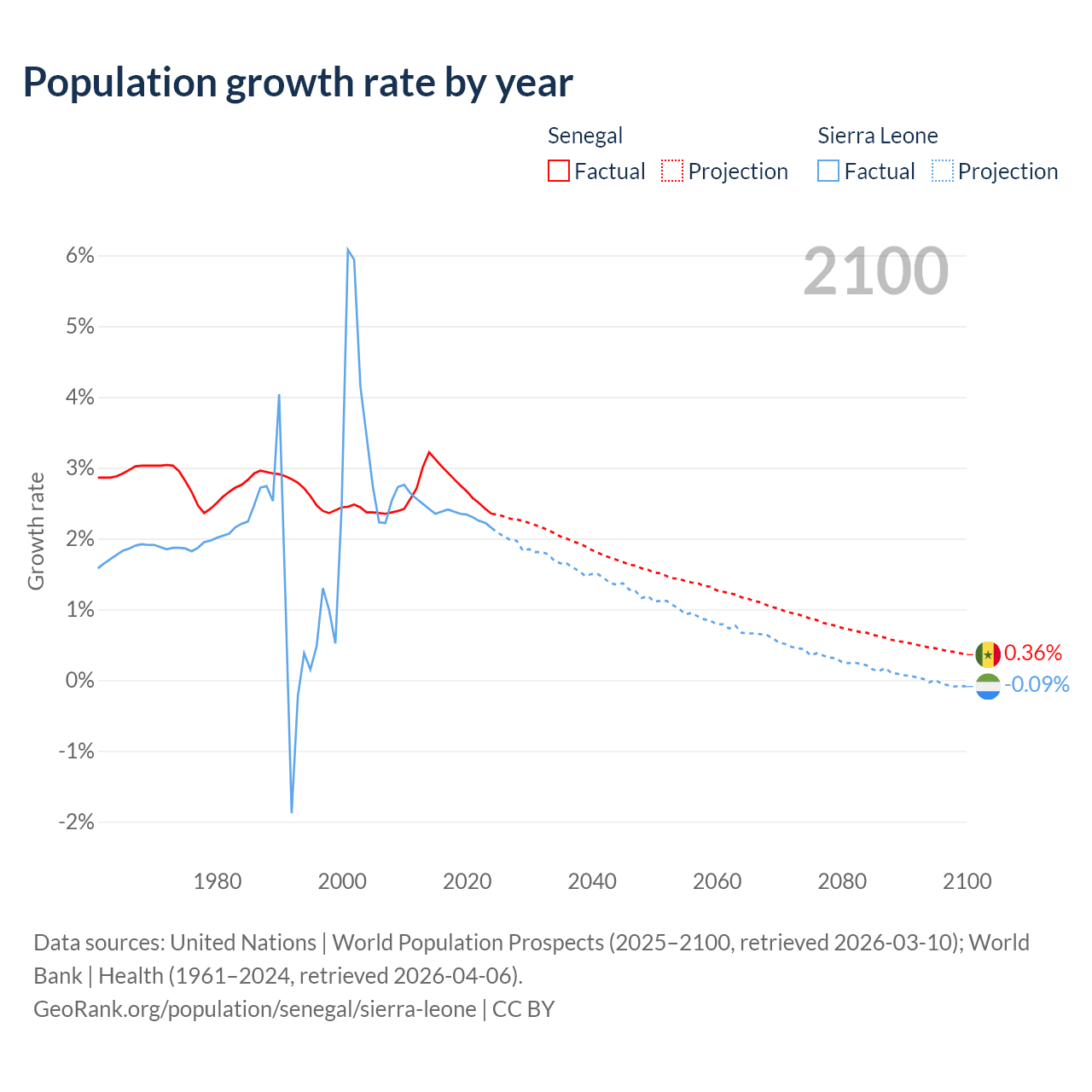 - For the last 10 years, Senegal has had an average growth rate of +2.76% per year vs +2.32% in Sierra Leone.