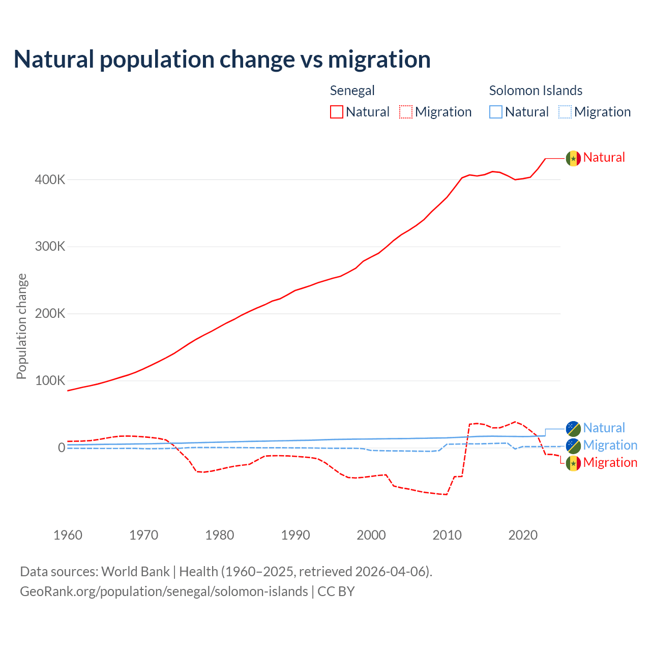 Over the last 10 years, 93.9% of the population change in Senegal is from natural causes (a gain of 4,089,205 people) and 6.13% is from migration (a gain of 267,266 people). In the Solomon Islands 82.8% is from natural causes (a gain of 168,727 people) and 17.2% is from migration (a gain of 35,031 people).