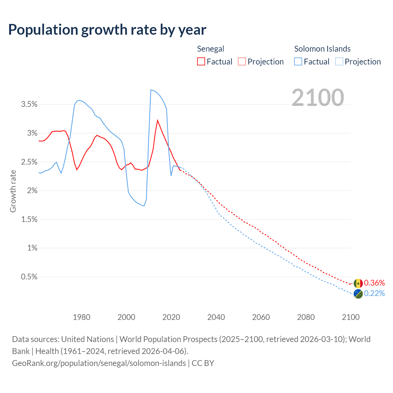 - For the last 10 years, Senegal has had an average growth rate of +2.76% per year vs +2.95% in the Solomon Islands.