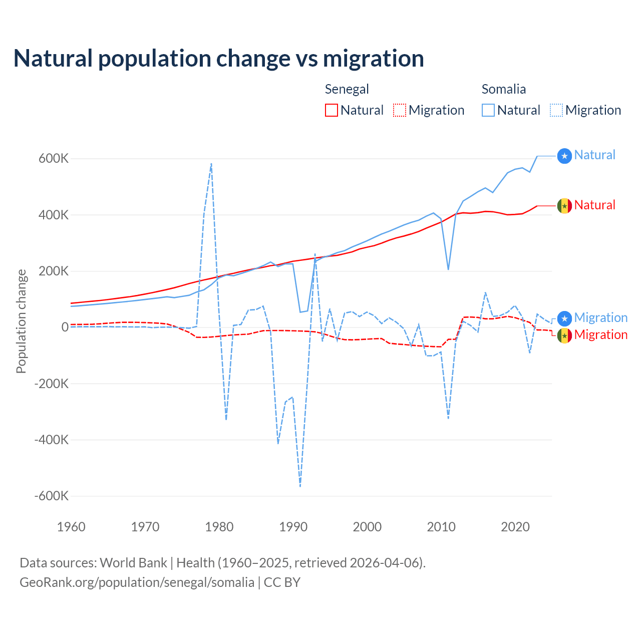 Over the last 10 years, 93.9% of the population change in Senegal is from natural causes (a gain of 4,089,205 people) and 6.13% is from migration (a gain of 267,266 people). In Somalia 94.4% is from natural causes (a gain of 5,270,105 people) and 5.58% is from migration (a gain of 311,487 people).