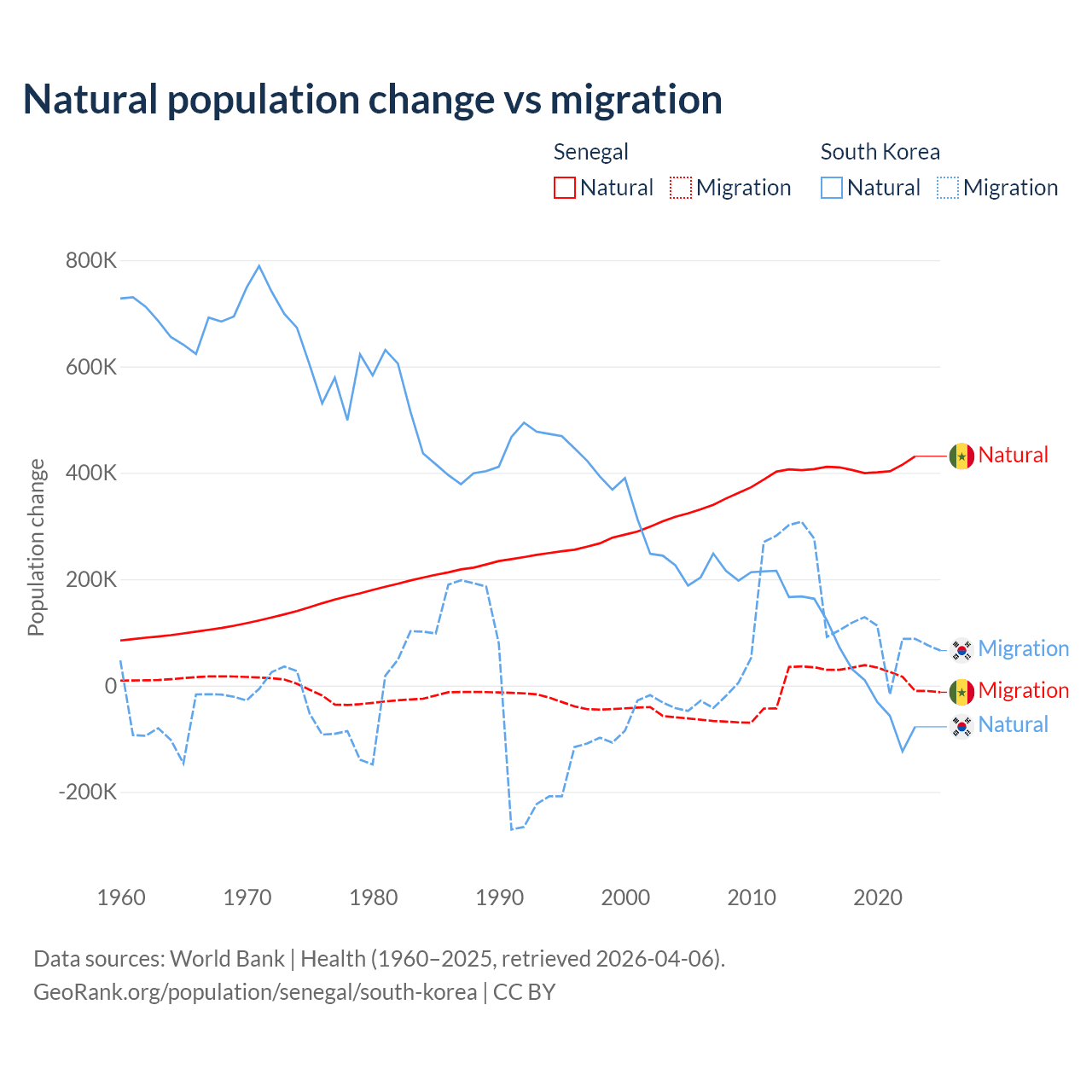 Over the last 10 years, 93.9% of the population change in Senegal is from natural causes (a gain of 4,089,205 people) and 6.13% is from migration (a gain of 267,266 people). In South Korea 17.6% is from natural causes (a gain of 277,215 people) and 82.4% is from migration (a gain of 1,298,356 people).