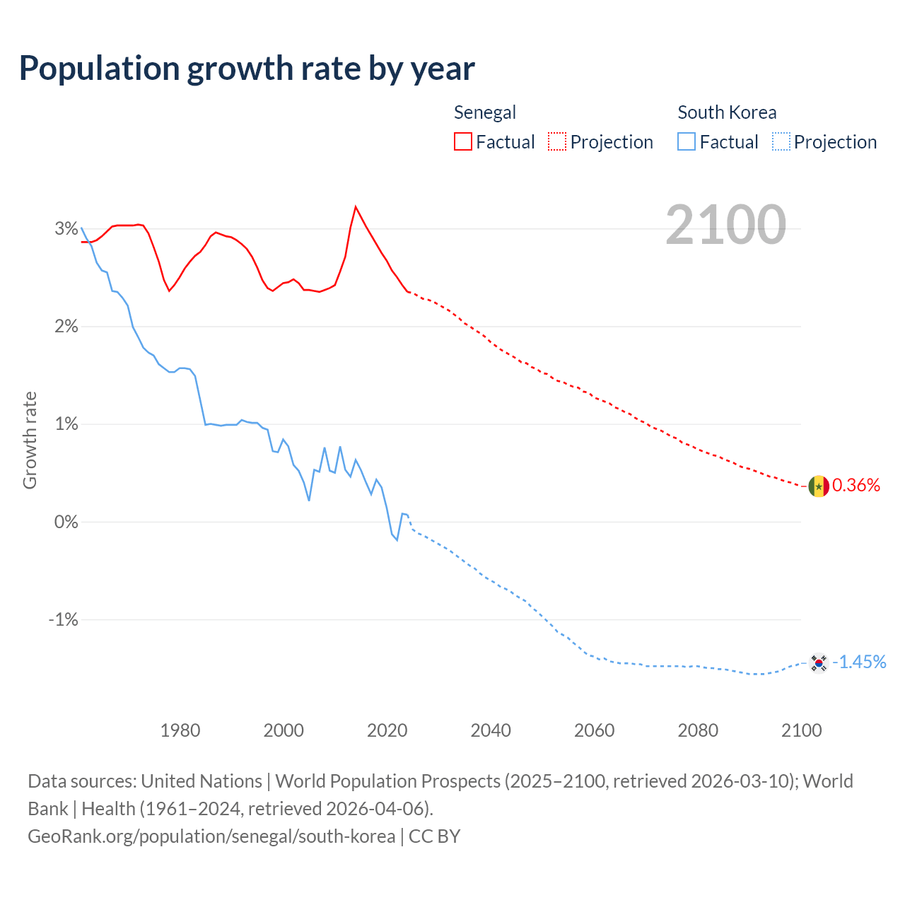 - For the last 10 years, Senegal has had an average growth rate of +2.76% per year vs +0.24% in South Korea.