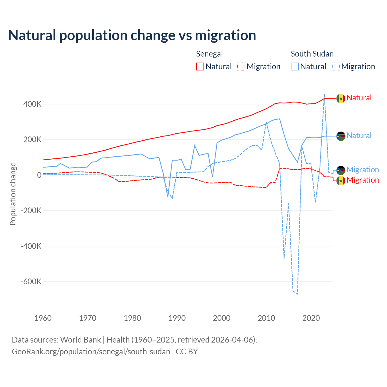 Over the last 10 years, 93.9% of the population change in Senegal is from natural causes (a gain of 4,089,205 people) and 6.13% is from migration (a gain of 267,266 people). In South Sudan 57.4% is from natural causes (a gain of 1,792,135 people) and 42.6% is from migration (a loss of 1,329,606 people).