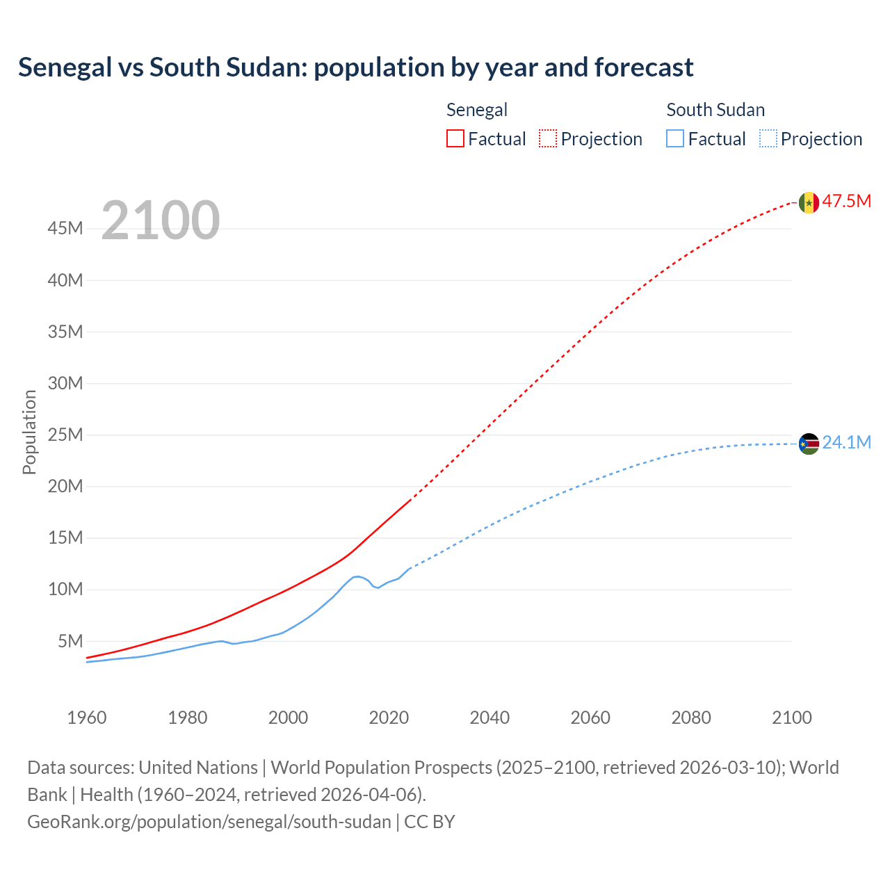 Senegal vs South Sudan: population by year and forecast