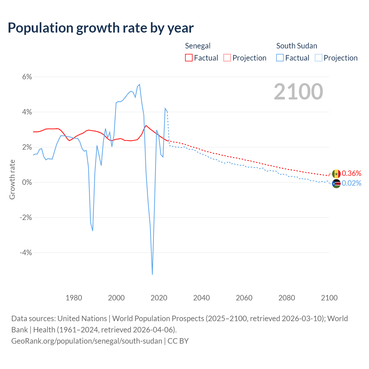 - For the last 10 years, Senegal has had an average growth rate of +2.76% per year vs +0.65% in South Sudan.
