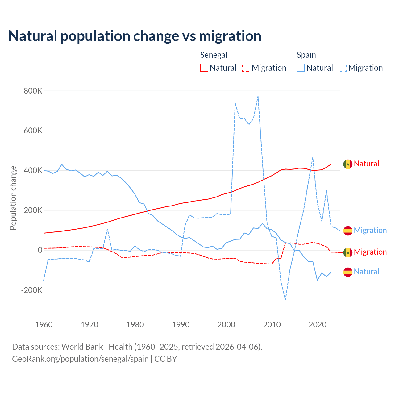 Over the last 10 years, 93.9% of the population change in Senegal is from natural causes (a gain of 4,089,205 people) and 6.13% is from migration (a gain of 267,266 people). In Spain 25.8% is from natural causes (a loss of 627,829 people) and 74.2% is from migration (a gain of 1,810,127 people).