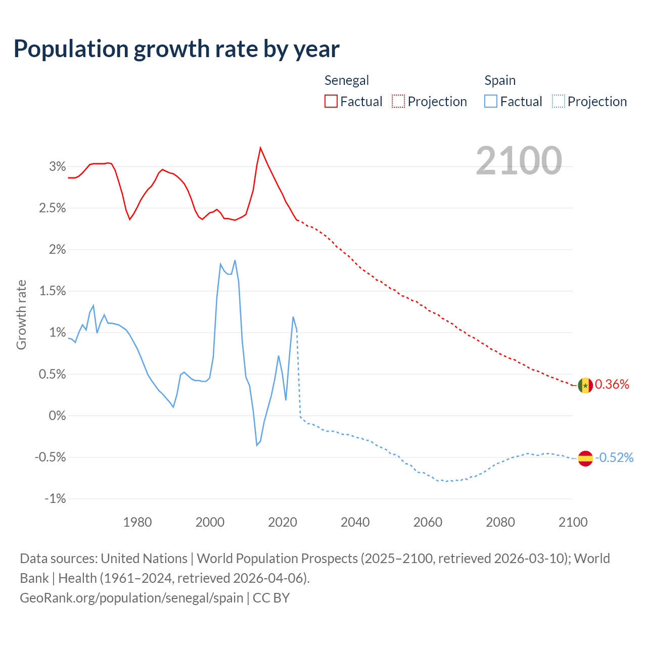 - For the last 10 years, Senegal has had an average growth rate of +2.76% per year vs +0.43% in Spain.