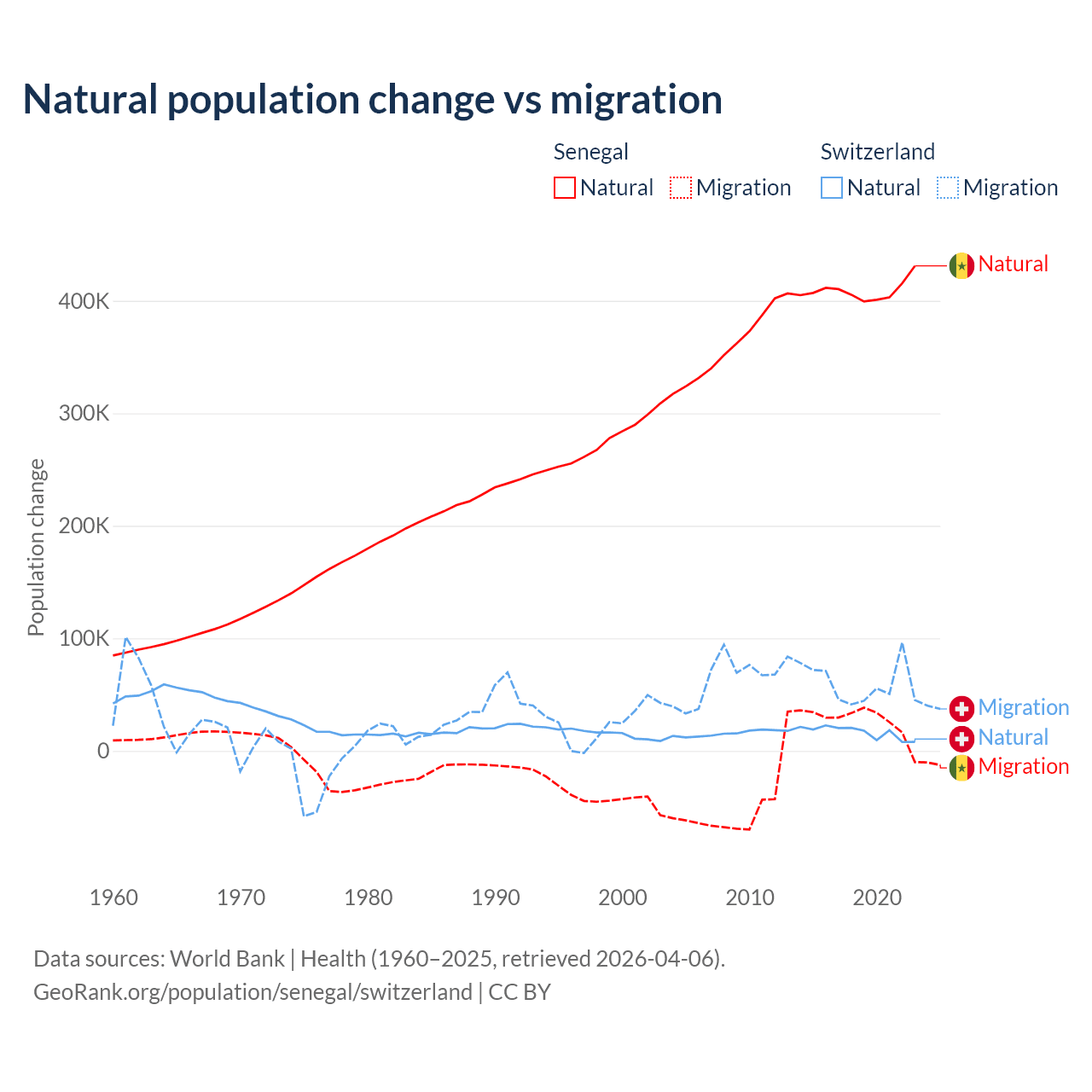 Over the last 10 years, 93.9% of the population change in Senegal is from natural causes (a gain of 4,089,205 people) and 6.13% is from migration (a gain of 267,266 people). In Switzerland 21.6% is from natural causes (a gain of 165,354 people) and 78.4% is from migration (a gain of 600,145 people).