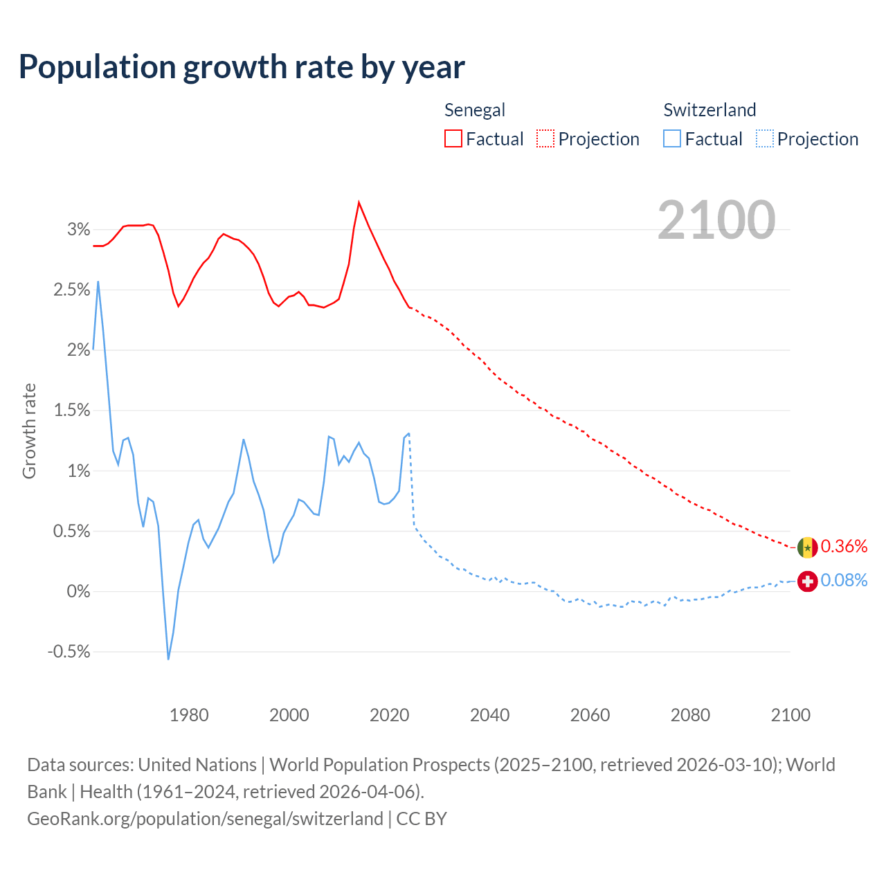- For the last 10 years, Senegal has had an average growth rate of +2.76% per year vs +0.98% in Switzerland.