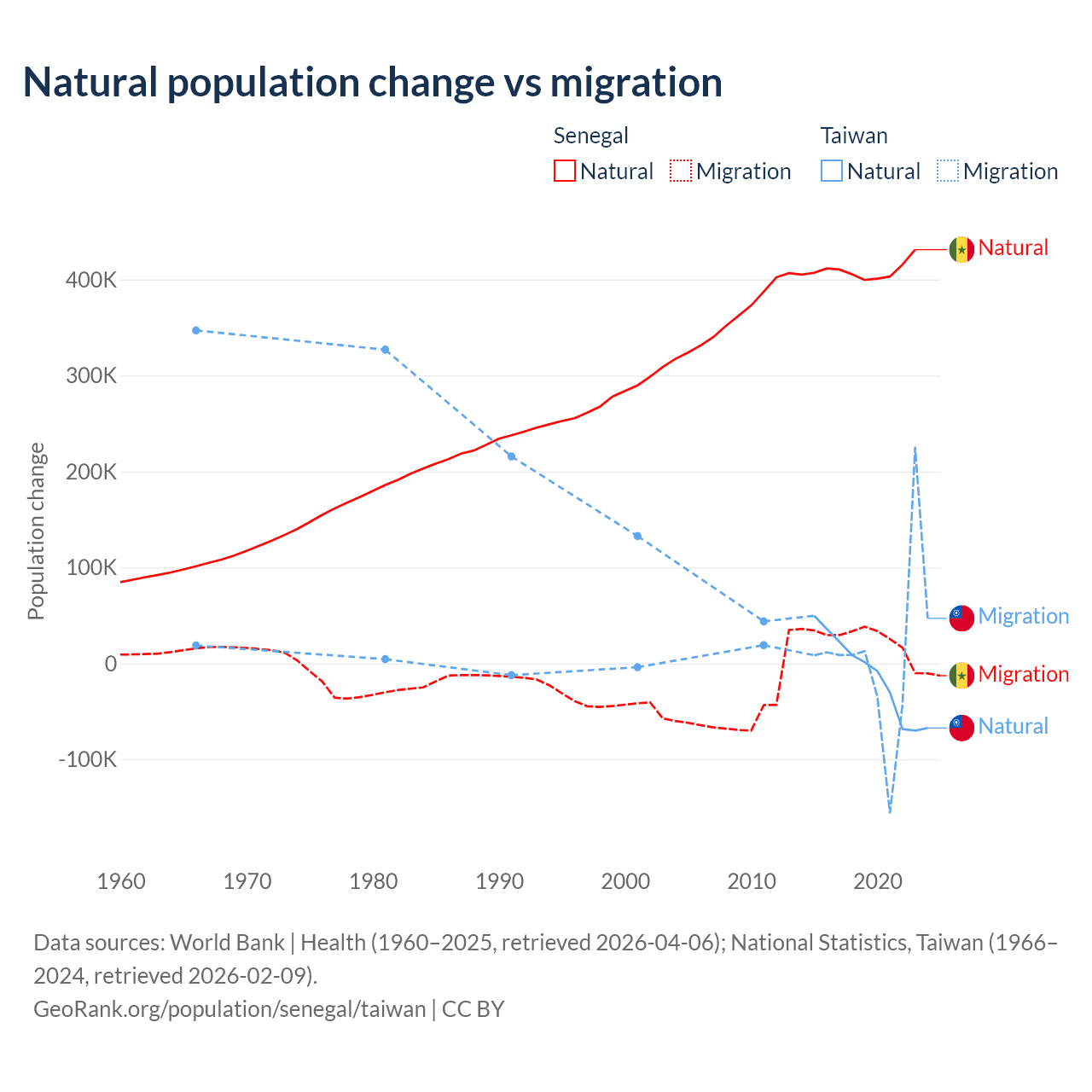 Over the last 10 years, 93.9% of the population change in Senegal is from natural causes (a gain of 4,089,205 people) and 6.13% is from migration (a gain of 267,266 people). In Taiwan 56.7% is from natural causes (a loss of 57,467 people) and 43.3% is from migration (a gain of 43,884 people).