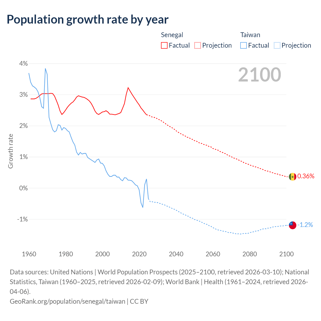 - For the last 10 years, Senegal has had an average growth rate of +2.76% per year vs -0.03% in Taiwan.