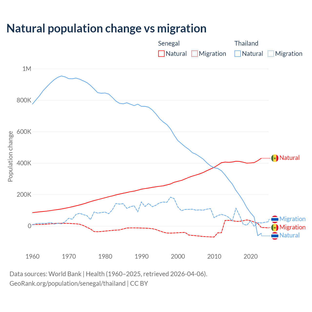 Over the last 10 years, 93.9% of the population change in Senegal is from natural causes (a gain of 4,089,205 people) and 6.13% is from migration (a gain of 267,266 people). In Thailand 78.4% is from natural causes (a gain of 1,292,528 people) and 21.6% is from migration (a gain of 355,361 people).