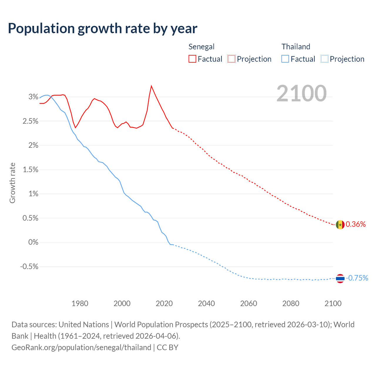 - For the last 10 years, Senegal has had an average growth rate of +2.76% per year vs +0.23% in Thailand.