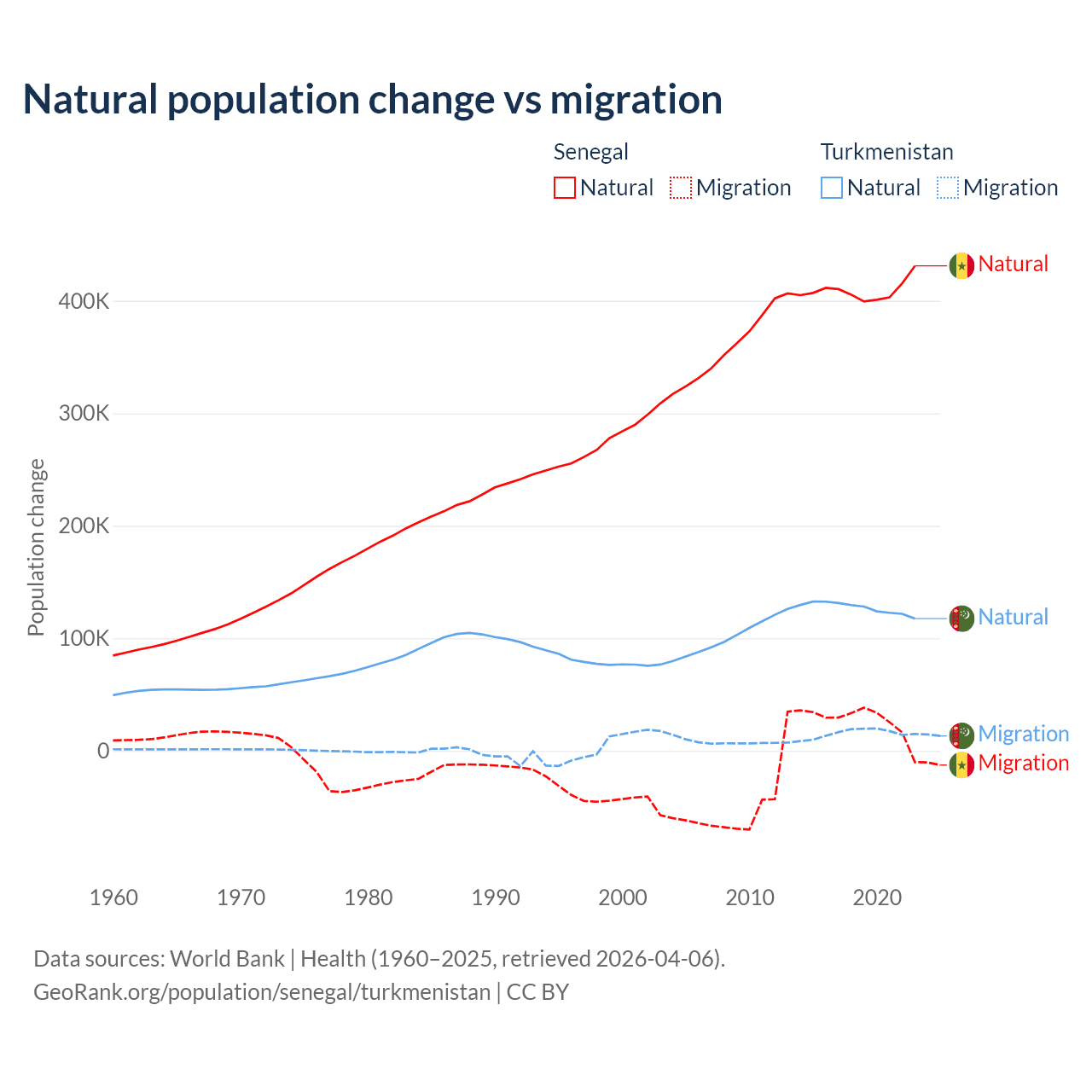 Over the last 10 years, 93.9% of the population change in Senegal is from natural causes (a gain of 4,089,205 people) and 6.13% is from migration (a gain of 267,266 people). In Turkmenistan 89.2% is from natural causes (a gain of 1,270,228 people) and 10.8% is from migration (a gain of 154,379 people).