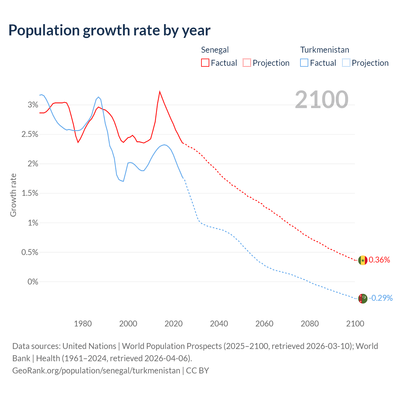 Data sources: World Bank | Health (1960–2024, retrieved 2026-04-06); United Nations | World Population Prospects (1960–2026, retrieved 2026-03-10); U.S. Census Bureau (1960–2025, retrieved 2026-02-08); Central Intelligence Agency (CIA) (2000–2019, retrieved 2026-02-20).