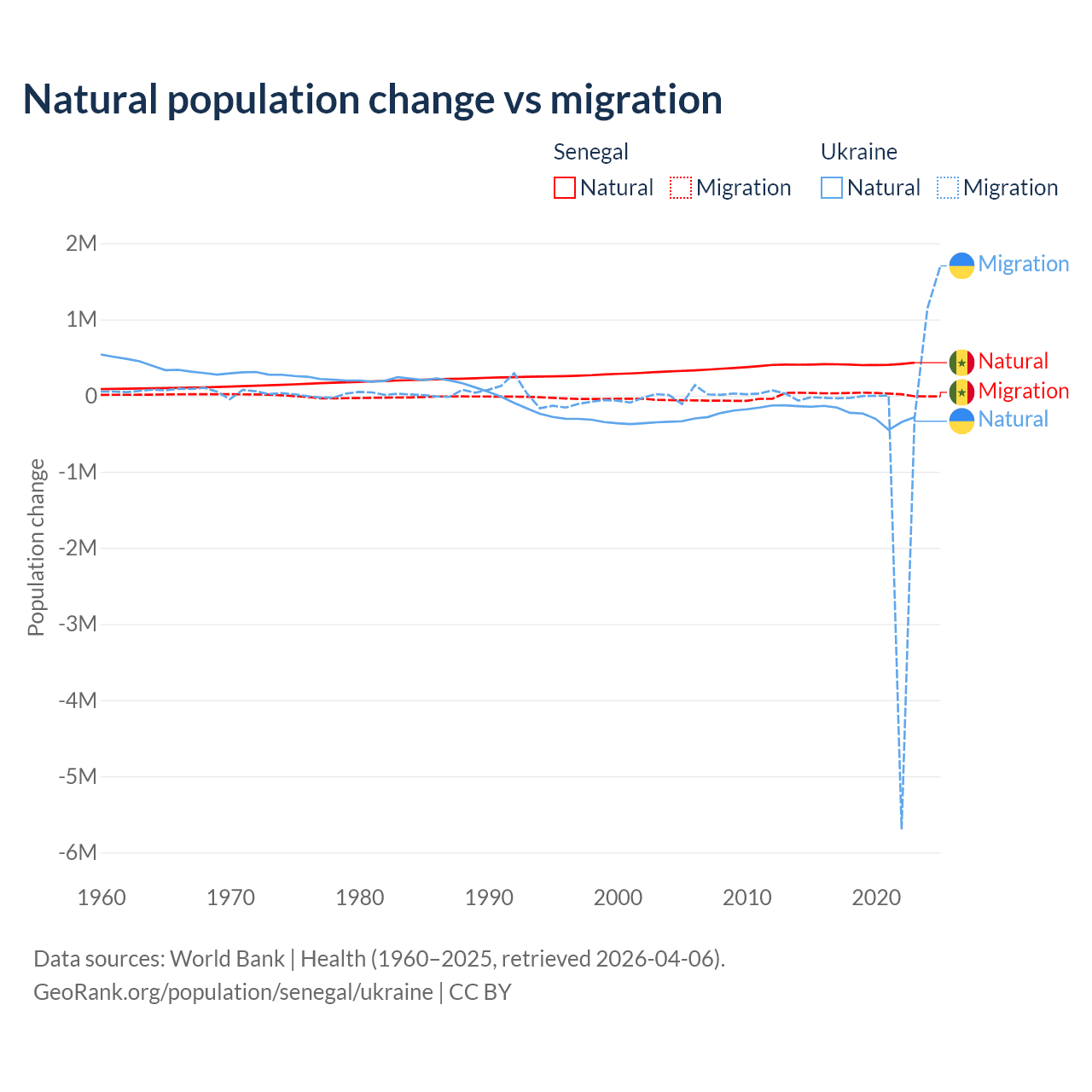 Over the last 10 years, 93.9% of the population change in Senegal is from natural causes (a gain of 4,089,205 people) and 6.13% is from migration (a gain of 267,266 people). In Ukraine 28.2% is from natural causes (a loss of 2,435,153 people) and 71.8% is from migration (a loss of 6,198,995 people).
