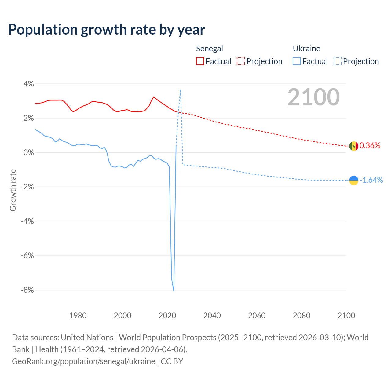 - For the last 10 years, Senegal has had an average growth rate of +2.76% per year vs -1.74% in Ukraine.