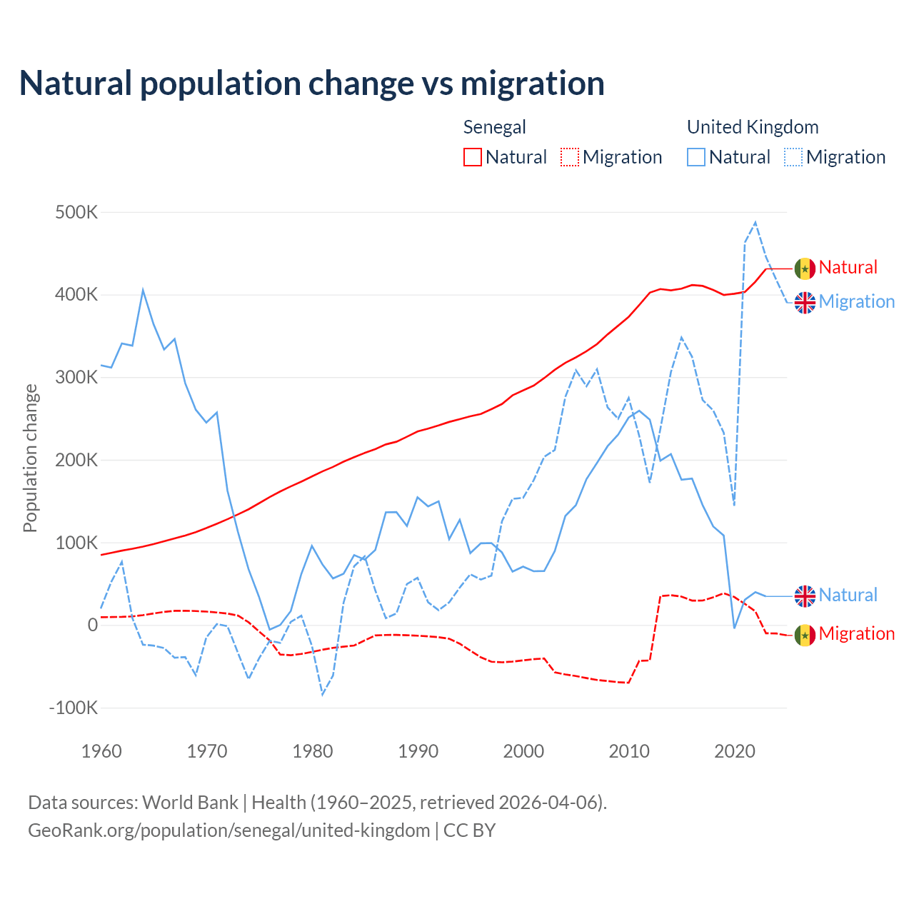 Over the last 10 years, 93.9% of the population change in Senegal is from natural causes (a gain of 4,089,205 people) and 6.13% is from migration (a gain of 267,266 people). In the United Kingdom 23.9% is from natural causes (a gain of 1,033,129 people) and 76.1% is from migration (a gain of 3,283,101 people).