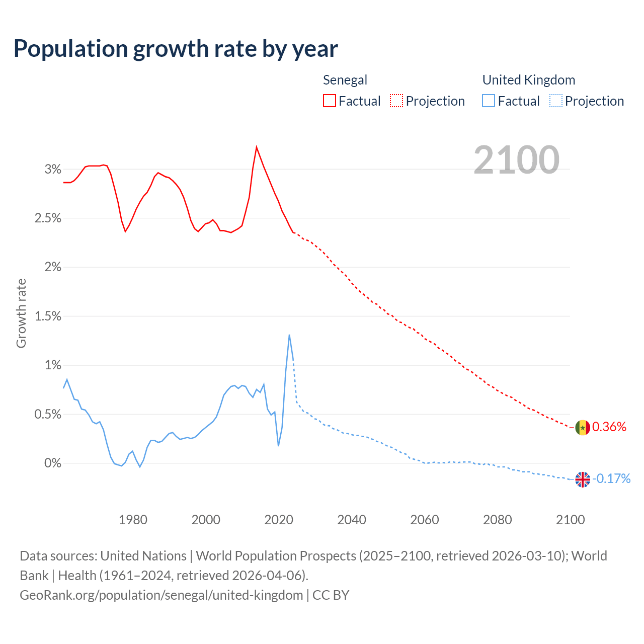 - For the last 10 years, Senegal has had an average growth rate of +2.76% per year vs +0.7% in the United Kingdom.