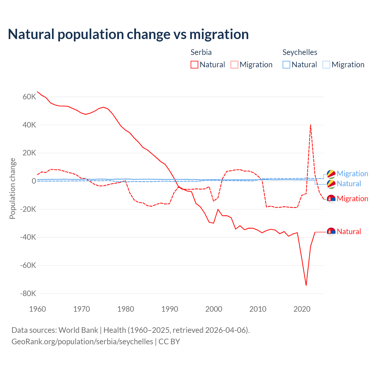 Over the last 10 years, 83.3% of the population change in Serbia is from natural causes (a loss of 435,148 people) and 16.7% is from migration (a loss of 87,110 people). In the Seychelles 31.4% is from natural causes (a gain of 8,122 people) and 68.6% is from migration (a gain of 17,748 people).